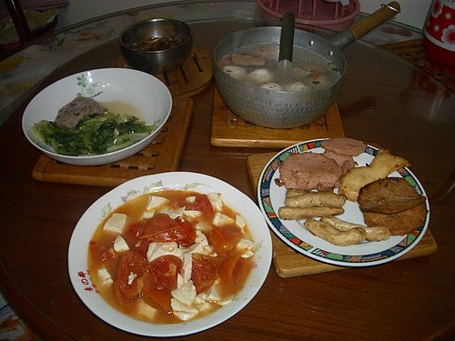 第一道菜蕃茄炒豆腐在我不管它3721之下,想說頂多吃了拉肚子情況下,終於還是搞定了。端上了餐桌,心中非常的得意,雖然沒老媽炒的那麼好吃,不過吃起來還真是不賴呢,沒有100分,也有90分哦!接著炒了一盤青菜、煎了幾片素火腿、炸了一些素甜不辣,最後再煮了一鍋素貢丸湯,終於沒辜負家人的期待,把晚餐煮好了。