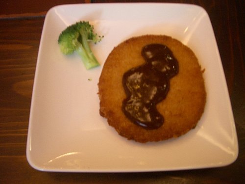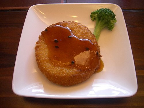 淋上百香果醬的素排,吃起來蠻特別的,很好吃!